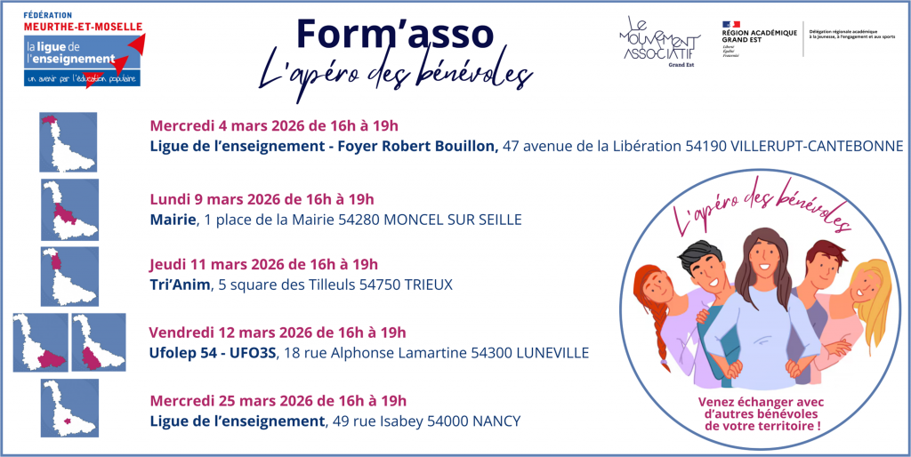 La Ligue de l’enseignement 54 vous propose des rencontres associatives de territoire sous la forme « d’apéro des bénévoles ». Ces temps d’échanges « Form’ asso » sont ouverts à tous les bénévoles qui souhaitent échanger et partager leur expérience, connaître les possibilités de montée en compétences (formations LMA, Dispositif Guid’asso) ou encore les pistes de financement pour son association.